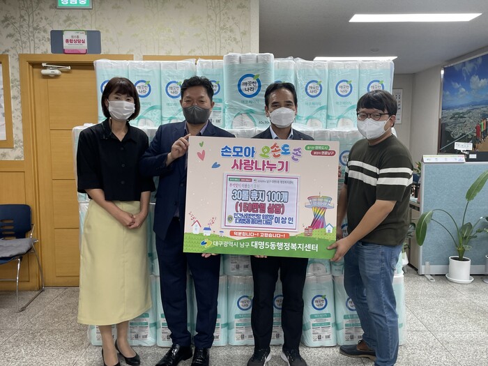 [로컬세계=박세환 기자]대구광역시 남구 대명5동 행정복지센터는 지난 1일, 대명5동 홈마트(대표 이상인)에서 추석을 맞아 관내 저소득층을 위해 30롤 휴지 100개를 후원했다고 2일 밝혔다.