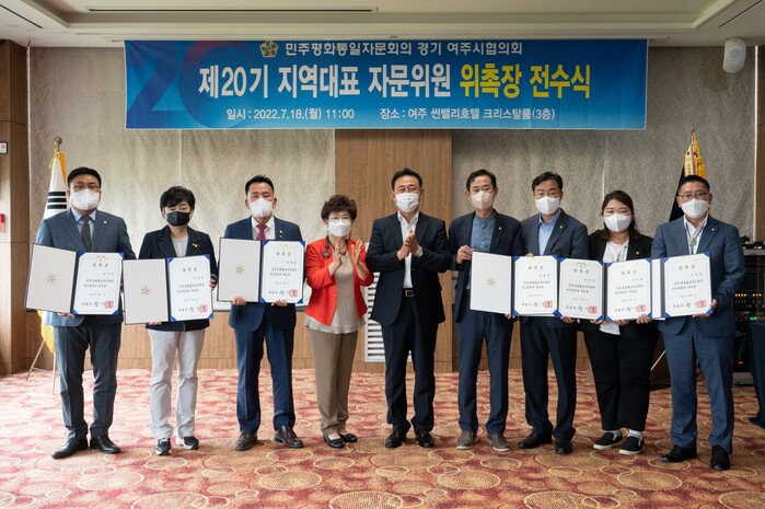 이번 위촉장 전수식은 대통령 자문위원으로서의 자긍심 제고와 향후 활동에 대한 의지를 높이기 위한 자리로, 지난 6.1 지방선거에서 당선된 신규 지역대표(시‧도의원) 자문위원에게 민주평통 의장인 대통령을 대신해 대행기관장인 이충우 여주시장이 위촉장을 전수했다. 여주시협의회 지역대표 자문위원은 시‧도의원 전원(9명)이다.