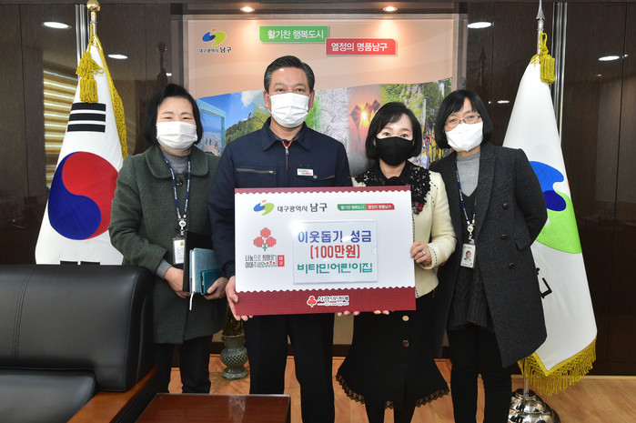 [로컬세계 박세환 기자]대구 남구청(구청장 조재구)은 지난 13일 비타민어린이집(원장 정영희)에서 남구청을 찾아 어려운 이웃을 위해 사용해달라며 성금 100만원을 기탁했다고 15일 밝혔다.