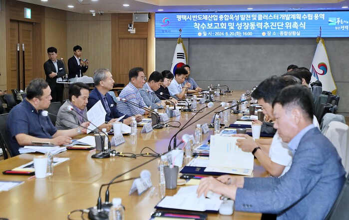 ▲ 평택시는 지난 20일 ‘평택시 반도체산업 종합육성 발전 및 클러스터 개발계획 수립 용역’ 착수보고회 및 ‘평택시 반도체산업 성장동력추진단’ 위촉식을 개최했다.(평택시 제공) |