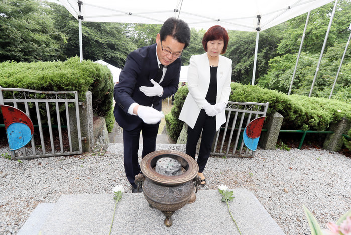 ▲권익현 군수가 호국영렬탑을 찾아 헌화·분향하고 있다. |