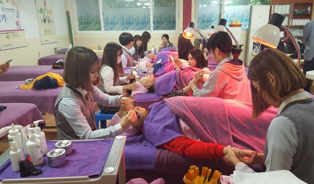 | ▲부산미용고 학생들이 보훈 복지대상자들을 대상으로 피부관리를 하고 있다. |