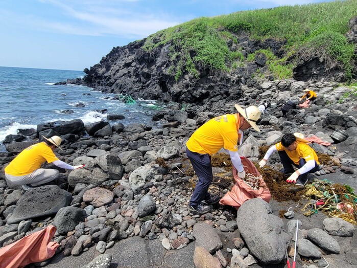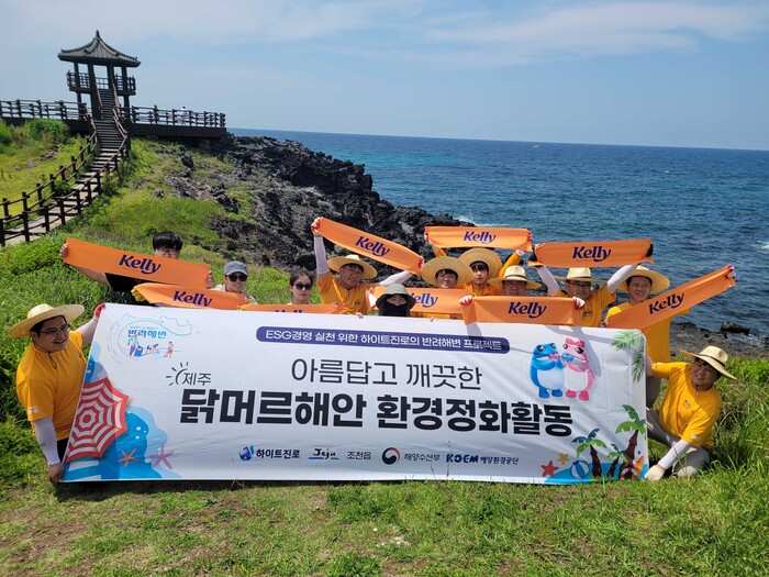 지난 22일 하이트진로 제주지점 임직원은 플로깅(조깅을 하며 쓰레기를 줍는 활동) 운영단체 ‘공유한국’ 회원들과 함께 제주시 조천읍 닭머르 해안에서 약 200kg의 쓰레기를 수거했다. 이날 수거된 쓰레기의 양은 해양 환경문제 해결을 위한 데이터로 활용된다.