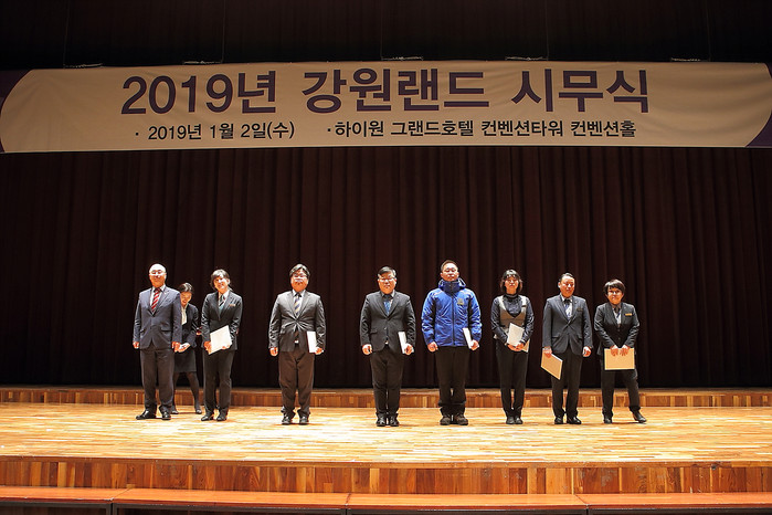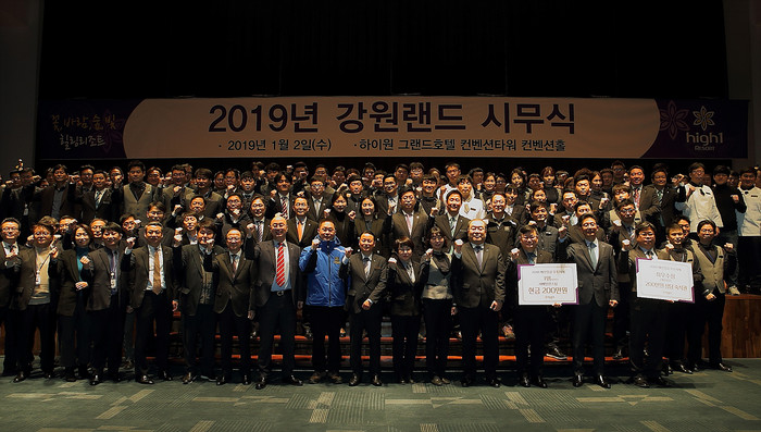 ▲2일 하이원 그랜드호텔 컨벤션홀에서 열린 ‘2019년 시무식’에 참가한 500여 명의 강원랜드 임직원들이 단체사진을 찍고 있다. |