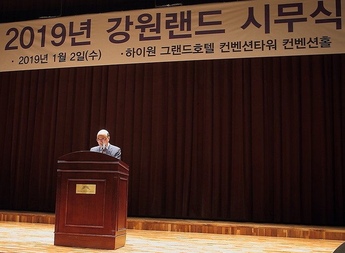 ▲2일 하이원 그랜드호텔 컨벤션홀에서 열린 ‘2019년 시무식’에서 문태곤 강원랜드 대표가 신년사를 발표하고 있다.(강원랜드 제공) |