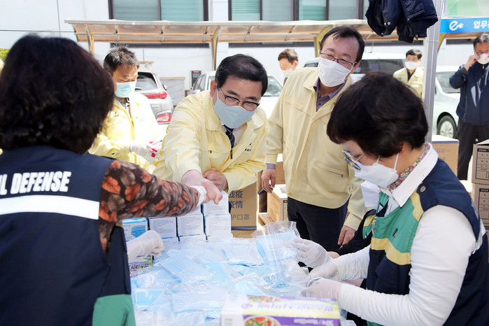 소포장된 마스크는 오는 6일부터 65세 이상부터 74세까지 9만2790명에게 개인당 델탈 마스크 5매씩 50만부를 공무원과 이‧통장, 자원봉사자가 직접 방문해 전달할 예정이다.