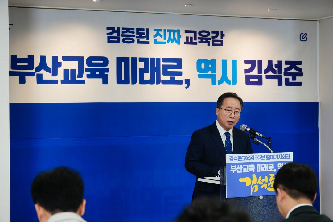김 교육감은 23일 오전 11시 부산 부산진구 서전로1 삼성빌딩 2층 ‘김석준 캠프’에서 출마 기자회견을 열고 “지난 9년 동안 부산시민과 교육가족의 단합된 힘으로 일궈낸 성과를 바탕으로 부산교육의 정상화를 넘어, 이제는 미래로의 대전환을 위해 부산시교육감 선거에 출마한다”고 선언했다.