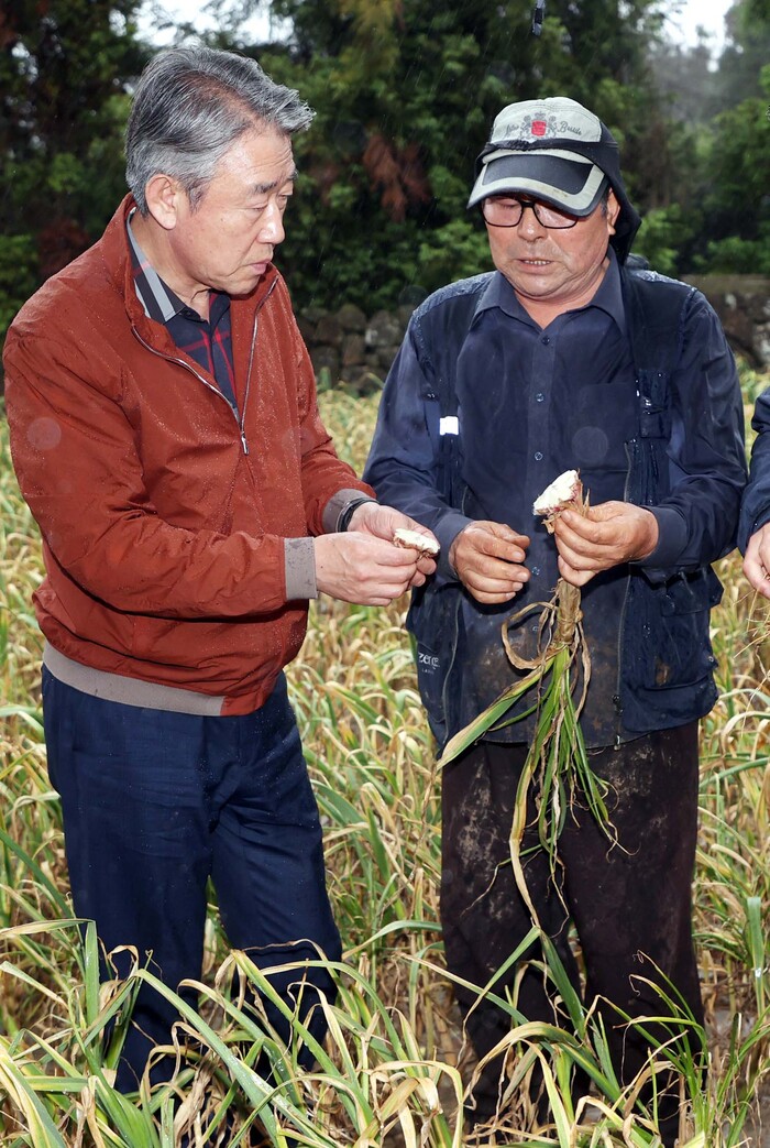 ▲강호동 농협중앙회장(오른쪽)이 지난 11일 제주 서귀포시 대정읍 벌마늘 피해현장을 방문하여 피해 농업인을 위로하고 있다. 농협 제공 |