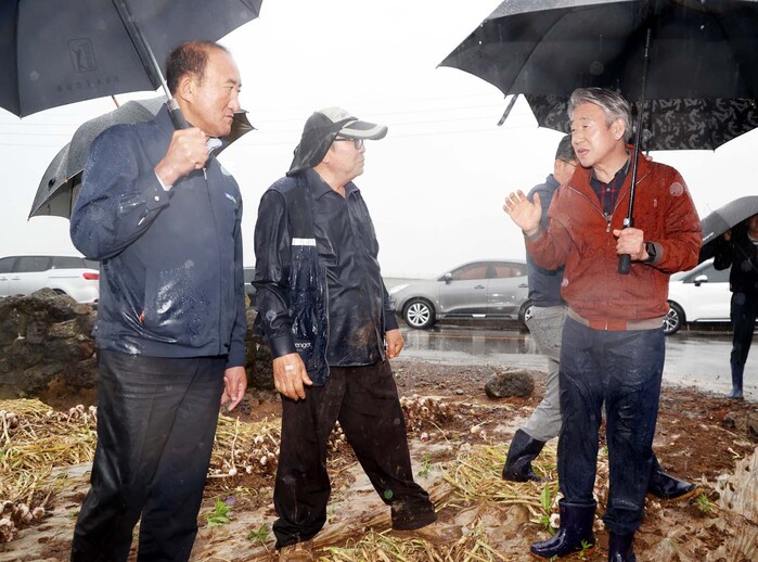 ▲강호동 농협중앙회장(왼쪽)이 지난 11일 제주 서귀포시 대정읍 벌마늘 피해현장을 방문하여 피해 농업인을 위로하고 있다. 농협 제공 |