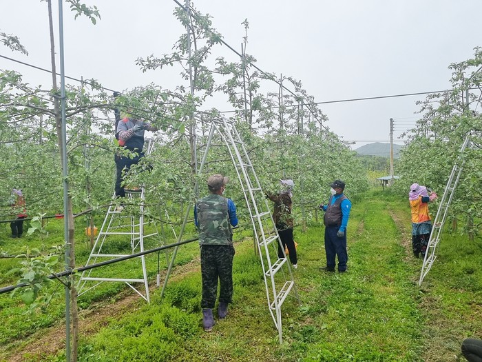 영농 현장 교육은 농작업 경험이 부족한 초보 작업자를 대상으로 농가에서 현장 교육을 실시하고 교육비의 일부를 지원하는 사업으로, 농사 경험이 풍부한 농가에서 농작업 효율이 적은 초보 인력팀을 대상으로 사과 적과·잎소지 등 현장 교육을 실시했다.