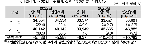 관세청은 1월 1~20일 기간 수출이 336억 달러로 작년 같은 기간보다 2.7%(9억3000만 달러↓) 줄었다고 21일 밝혔다.