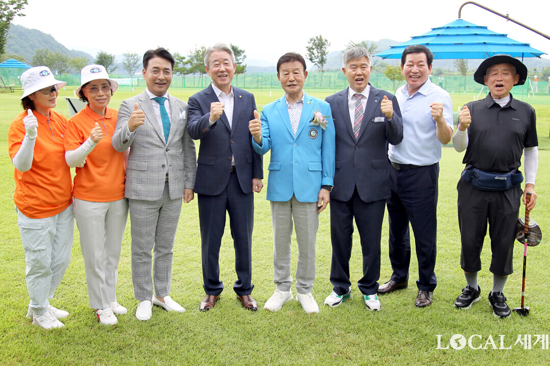 28일 경기 연천파크골프장에서 열린 ‘제1회 농협중앙회장배 농업인 파크골프대회’ 개막식에서 강호동 농협중앙회장(맨앞줄 왼쪽 네번째)을 비롯한 주요 내빈과 선수들이 성공적인 대회 개최를 다짐하고 있다. ( 가운데 줄 왼쪽부터) 홍석조 대한파크골프협회장, 김덕현 연천군수, 김성원 국민의힘 의원, 강 회장, 박경식 농협중앙회 이사, 진경만 농협중앙회 이사, 김미경 연천군의회 의장