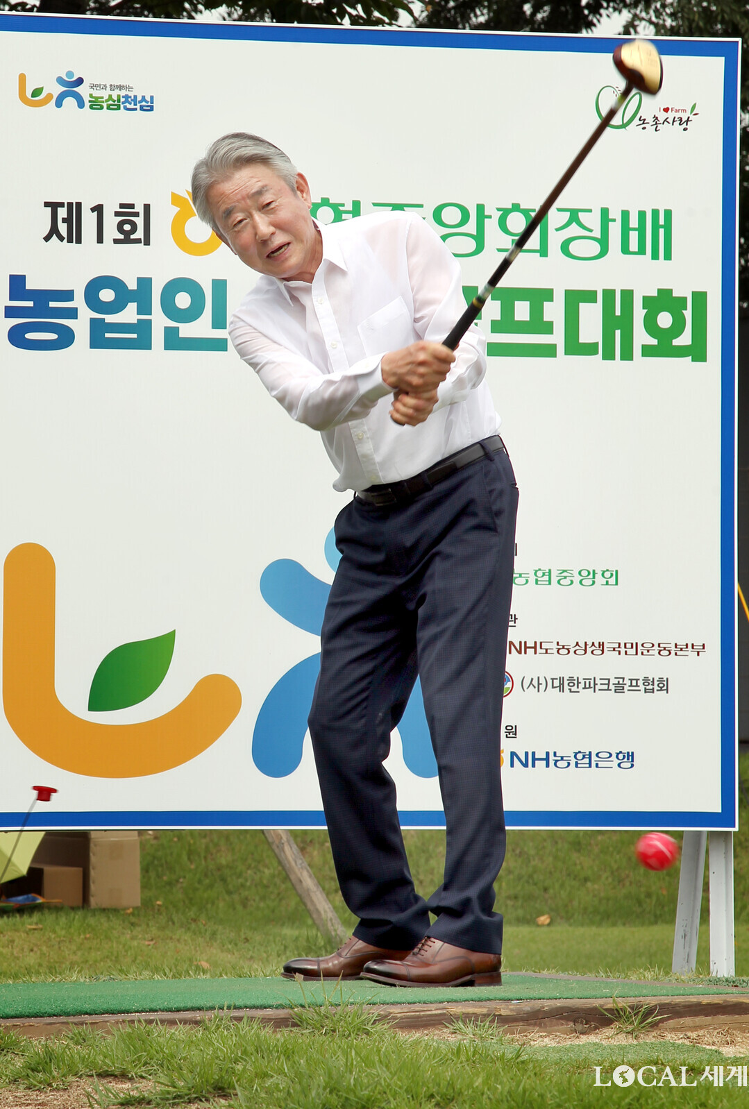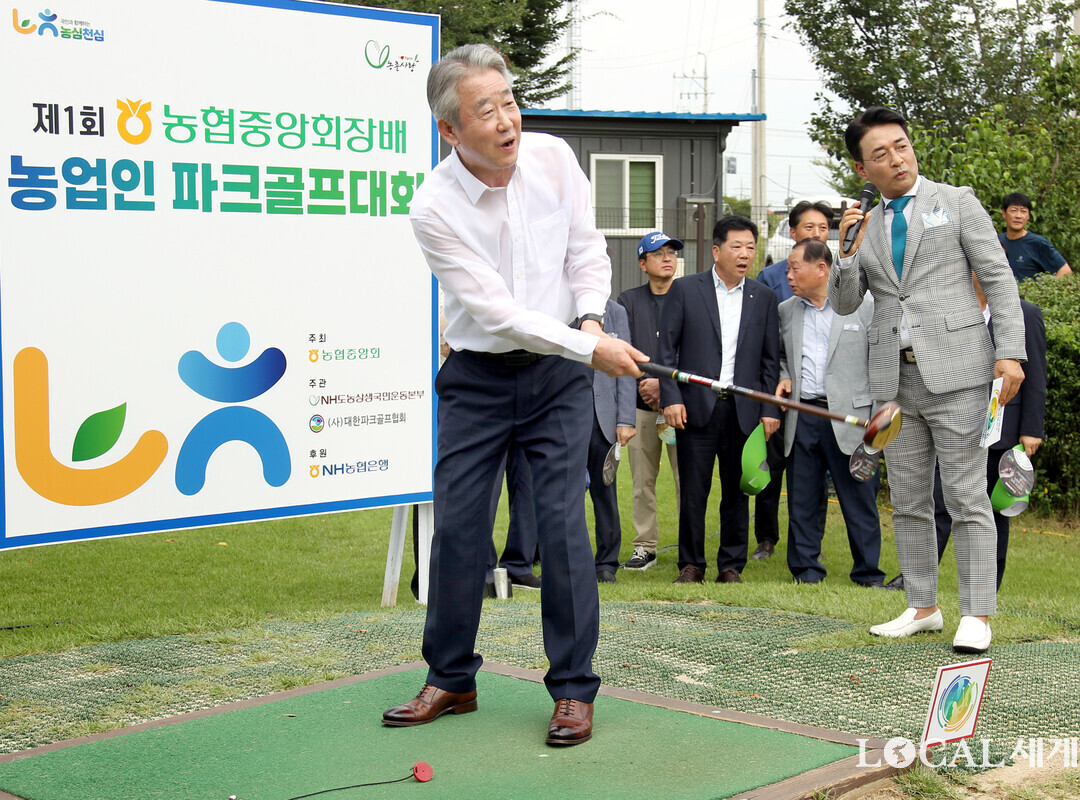 농협중앙회(회장 강호동)는 28일, 경기 연천파크골프장에서「제1회 농협중앙회장배 농업인 파크골프대회」개막식을 개최했다. 강호동 회장이 시타로 대회의 시작을 알리고 있다.