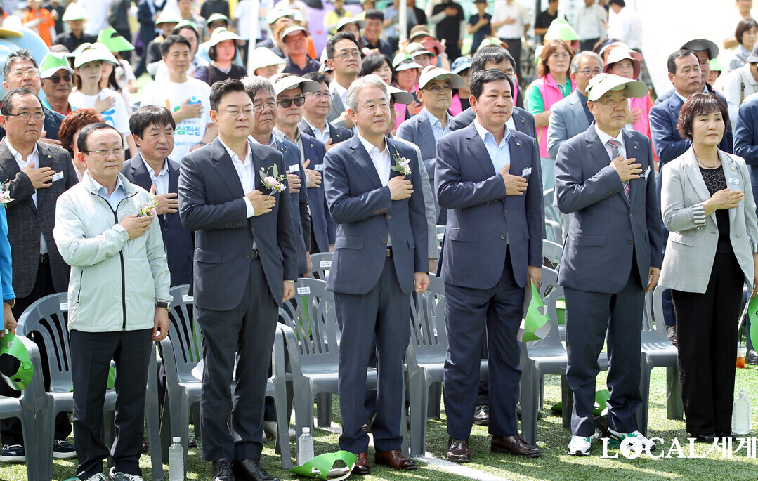 농협중앙회(회장 강호동)는 28일, 경기 연천파크골프장에서「제1회 농협중앙회장배 농업인 파크골프대회」개막식을 개최했다. 강호동 회장과 참석자들이 국민의례를 하고 있다.