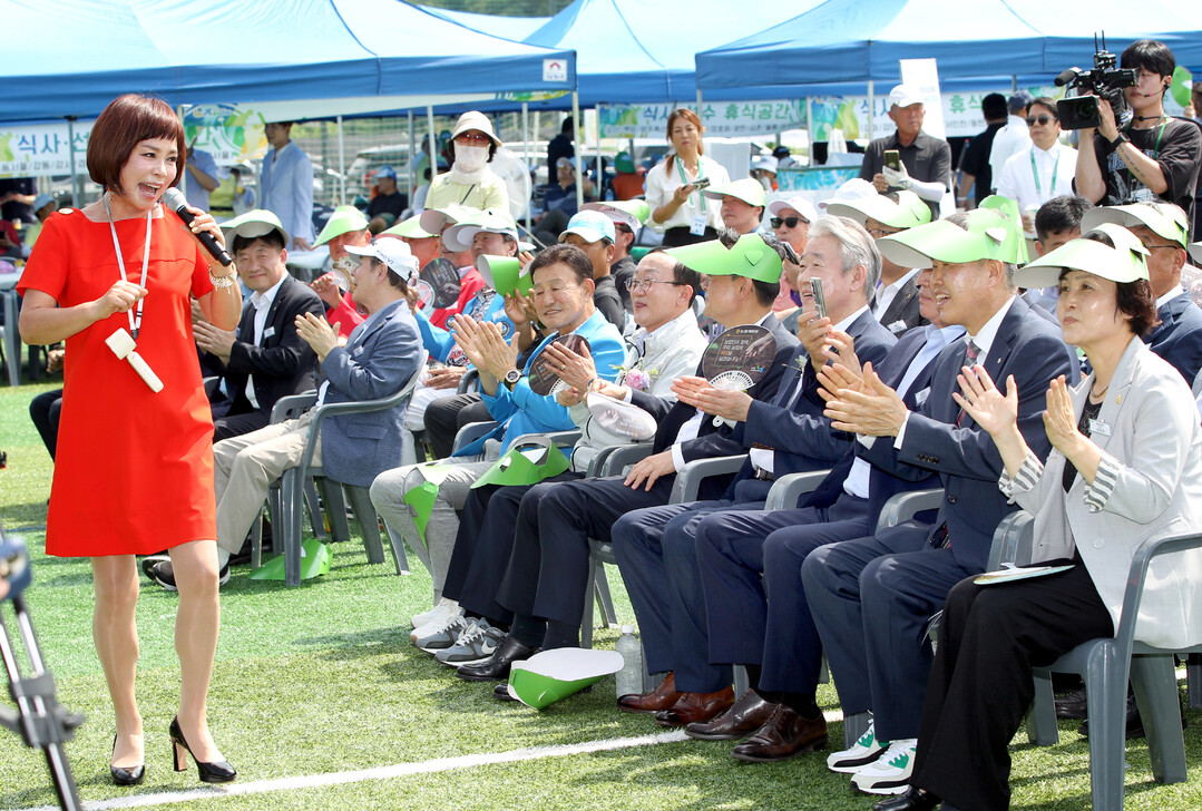 농협중앙회(회장 강호동)는 28일, 경기 연천파크골프장에서「제1회 농협중앙회장배 농업인 파크골프대회」개막식을 개최했다. 가수 현숙이 축하공연을 하고 있다.