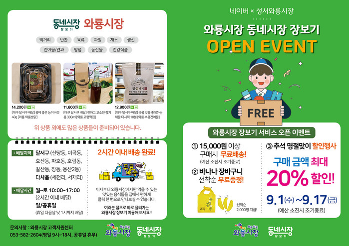 [로컬세계 박세환 기자]대구 달서구는 지난달 11일부터 네이버쇼핑 동네시장 장보기 서비스를 도입한 와룡시장이 추석명절을 맞아 이달 17일까지 구매금액 최대 20% 할인행사를 진행한다고 2일 밝혔다.