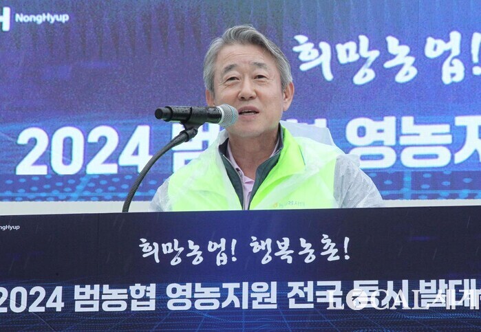 강호동 회장이 인사말을 하고 있다. 농협중앙회는 15일 경북 의성군에서 본격적인 영농철이 도래하였음을 국민들에게 알리고 범국민적 농촌일손돕기 참여 확산을 위한 2024년「범농협 영농지원 전국 동시 발대식」을 개최했다.