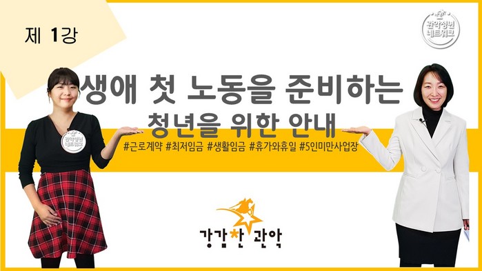 강좌는 총 5강이며, ▲생애 첫 노동을 준비하는 청년을 위한 안내 (근로계약, 최저임금, 근로시간) ▲창업을 준비하는 청년을 위한 안내 (채용공고, 근로계약, 4대보험, 근로시간) ▲일하는 청년? 이것만은! (노동조합, 직장괴롭힘, 성희롱, 산재, 사직) ▲사업하는 청년? 이것만은! (유연근무, 영업양도, 징계·해고, 퇴직연금) ▲알아두면 도움이 되는 제도 (체당금, 실업급여, 노동청 진정, 노동위원회 구제신청)를 주제로 청년들이라면 누구나 궁금해 하는 내용을 담았다.
