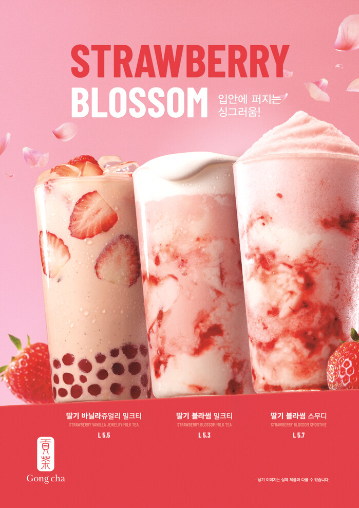 이번 신메뉴는 'STRAWBERRY BLOSSOM’을 테마로 ‘딸기 블라썸 밀크티’, ‘딸기 블라썸 스무디’, ‘딸기 바닐라 쥬얼리 밀크티’ 총 3종으로 구성됐다. 달콤한 딸기 과즙과 4시간마다 직접 우려낸 향긋하고 신선한 공차 오리지널 티 베이스를 조합해 제철 딸기의 맛을 더욱 깔끔하게 즐길 수 있다. 여기에 촉촉하고 부드러운 밀크 푸딩 토핑으로 새로운 맛과 즐거움을 선사할 예정이다.