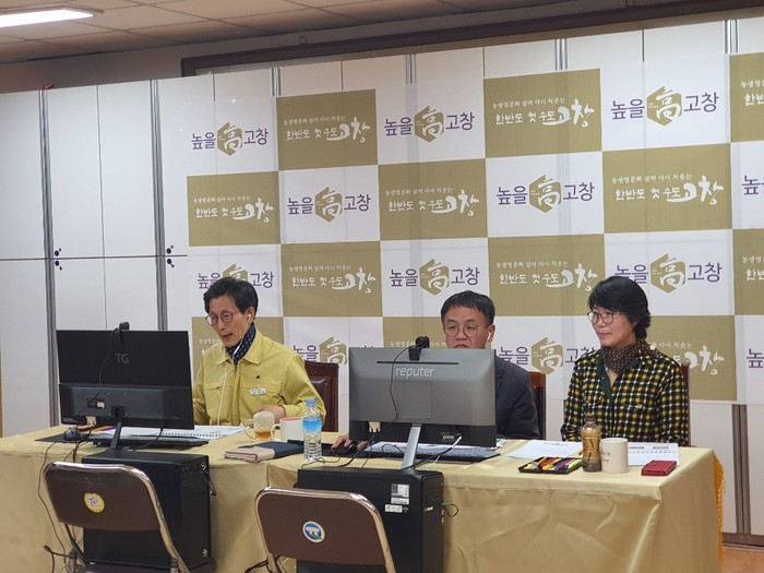 ▲유기상 고창군수가 화상으로 지역문화생태계 관련 발표를 진행하고 있다.(고창군 제공) |
