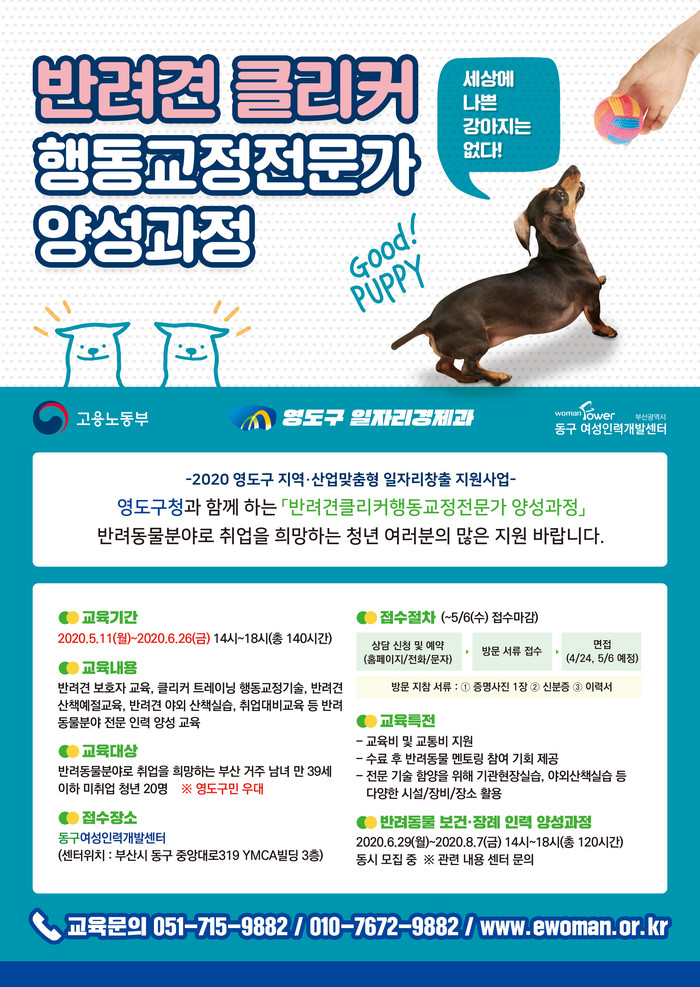 [로컬세계 맹화찬 기자]부산 영도구는 청년 구직자를 위한 일자리창출사업으로 ‘반려동물 클리커행동교정전문가 양성과정’ 훈련생 20명을 5월 6일까지 모집한다.