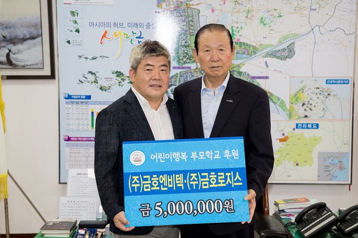 [로컬세계 양해수 기자]13일 이지태 ㈜금호엔비텍과 ㈜금호로지스 대표는 시를 방문해 문동신 시장 에게 시와 전북서부아동보호전문기관에서 공동으로 추진하는 어린이행복 부모학교 운영에 사용해 달라며 5백만원을 기탁했다.