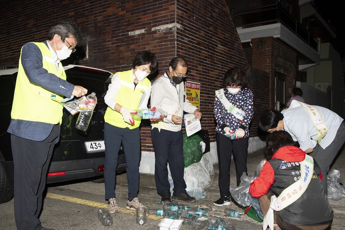 앞서 구는 시범 대상지역 약 845세대에 구가 직접 제작한 녹색 그물망을 배부하고 무색투명 페트병(음료수·생수 등)을 담아 버리도록 안내문을 배포했다.