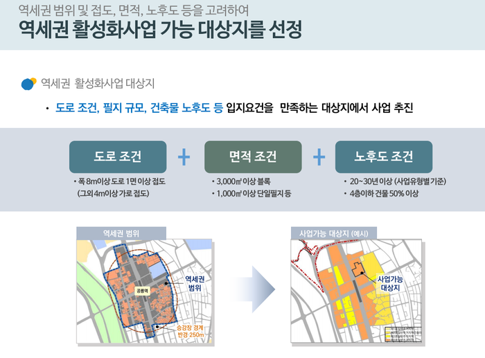 역세권 활성화사업은 역세권에서 ▲도로 조건 ▲필지 규모 ▲노후도 등 3가지 조건을 모두 만족하는 곳에서 시행할 수 있다. 대상지의 용도지역을 상향해주고 증가하는 용적률의 50%를 공공기여로 받아 지역에 필요한 시설을 확충한다.