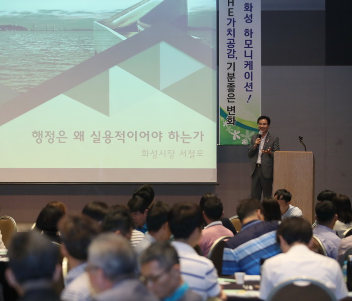 | ▲서철모 시장이 화성시 핵심비전 공유를 위한 팀장급 공무원 워크숍에서 특강을 진행하고 있다.(화성시 제공) |
