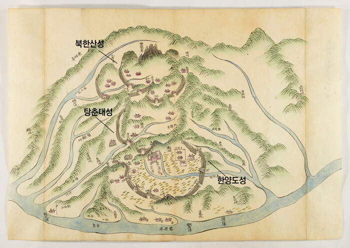| ▲ 도성연융북한합도(都城鍊戎北漢合圖)」 속 북한산성(위), 탕춘대성(중간), 한양도성(아래). 고양시 제공 |