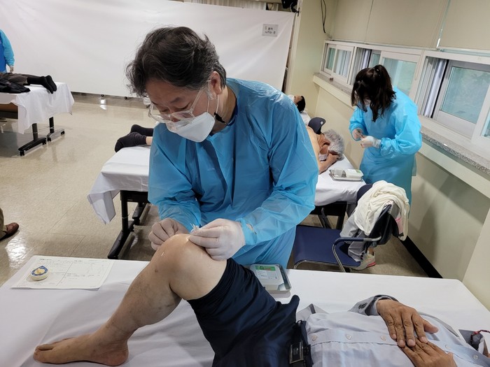 ▲수원자생한방병원 윤문식 병원장이 무릎이 불편한 어르신에게 침치료를 시행하고 있다. |