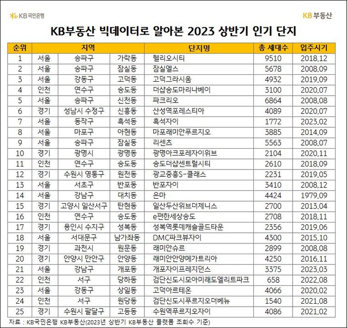 KB국민은행(은행장 이재근)의 부동산 정보 플랫폼 KB부동산이 2023년 상반기 인기 단지 순위를 발표했다. 올 1월부터 6월까지 상반기 동안 KB부동산 플랫폼을 방문한 고객이 가장 많이 검색한 단지를 집계한 결과다.