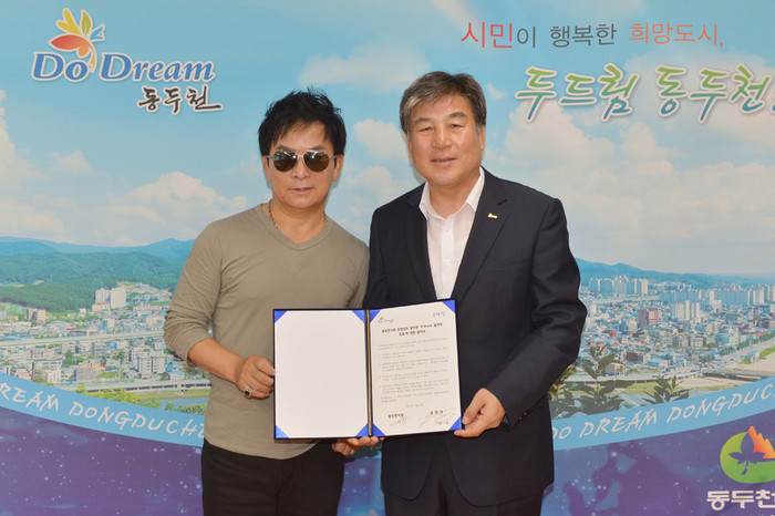 ▲가수 유현상 씨(왼쪽)와 오세창 동두천시장이 업무협약을 맺은 뒤 기념촬영을 하고 있다. |