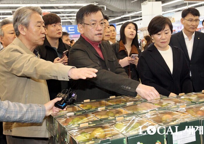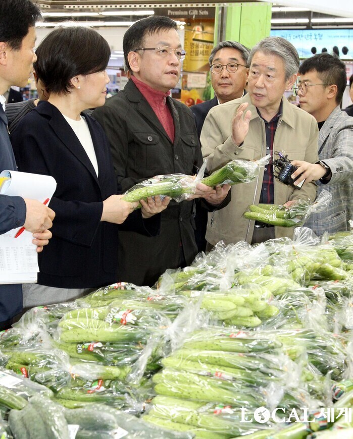 최 부총리와 송 장관은 먼저 과일·채소 매장을 방문하여 사과·배, 대파·애호박 등 주요 농산물의 수급 및 가격 동향을 점검하였다.