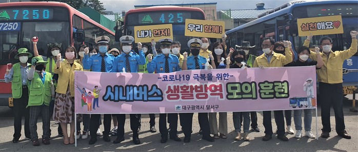 [로컬세계 박세환 기자]대구 달서구는 지난 26일 매월 넷째 주 실시되는 ‘코로나19 극복 방역의 날’을 맞아 성서공단 인근 시내버스 회차지에서 코로나19로 인해 시민들의 불안을 해소하고, 깨끗하고 쾌적한 시내버스를 만들기 위해 시내버스 생활방역 모의훈련을 실시했다.
