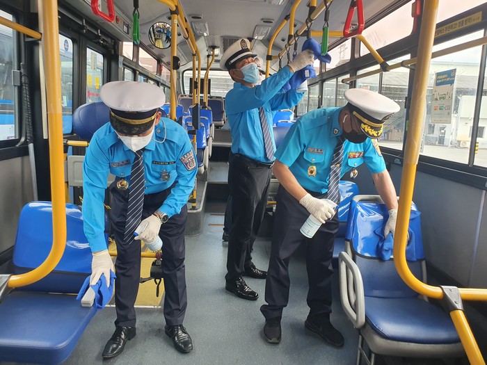이날 모의훈련은 시내버스 방역관리자 및 버스기사, 교통봉사단체와 구청 직원 등이 참석하여 시내버스의 정기방역 상황 점검, 코로나19 확산 방지를 위한 생활방역 수칙 교육, 회차지로 들어온 버스에서 실제 방역작업을 했다.