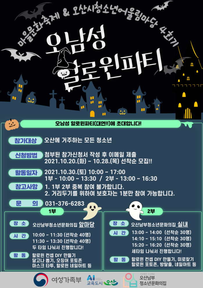 [로컬세계 김병민 기자]경기 오산시(시장 곽상욱)와 여성가족부가 주최하고 오산남부청소년문화의집에서 주관하는 마을문화축제와 2021년 오산시청소년 어울림마당 4회기 행사인 '오남성 할로윈 축제'를 오는 30일 오산 남부청소년 문화의집 앞마당에서 개최한다고 26일 밝혔다.