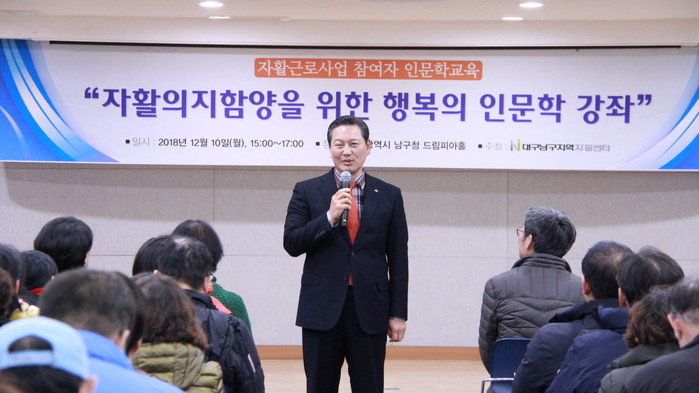 [로컬세계 박세환 기자]대구 남구청은 지난 10일 구청 드림피아홀에서 남구지역자활센터 주최로 ‘건강한 행복을 위한 웃음과 노래’ 행복 인문학 강좌를 가졌다고 11일 밝혔다.