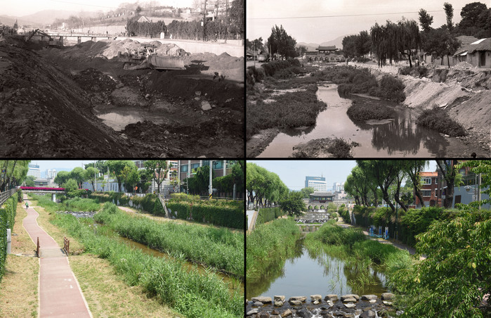 | ▲1976년 11월 수원천 매향중 앞 모습(왼쪽 위)과 1971년 8월 화홍문 앞 풍경(오른쪽). 아래 사진은 현재. |