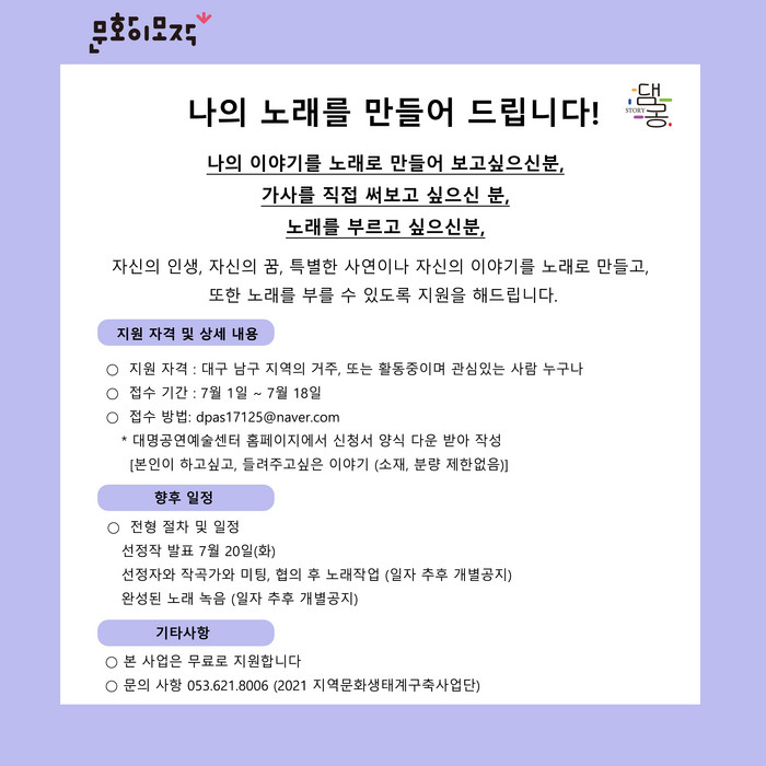 사업 주관처인 대명공연예술단체연합회(대표 이동수)는 ‘코로나19 사태에 마냥 움츠려만 있을 수 없고 주민들이 지역을 기반으로 한 문화자산들을 직접 발굴하고 활용하는 과정을 주민주도로 진행할 것’이라고 강조했다.
