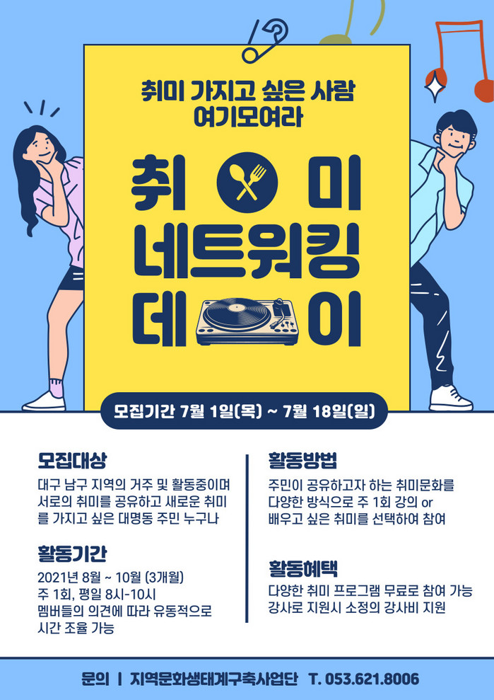 모집 분야는 문화행사 기획과 취미 활동 크리에이터를 발굴하는 ‘취미네트워킹데이’와 자신의 인생노래를 만들어보는 ‘나의 노래를 만들어 드립니다’ 두 가지 프로그램이다.