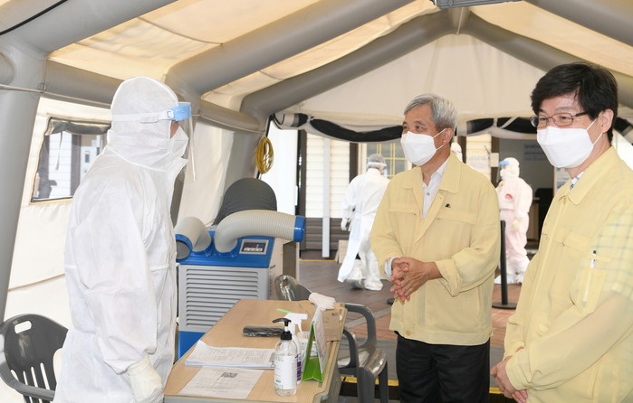 [로컬세계 김병민 기자]곽상욱 오산시장이 6일 관내 코로나19 특별방역 현장을 방문해 무더운 날씨에 고생하고 있는 현장근무자들과 자원봉사자들을 격려했다.