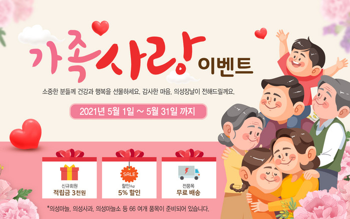 ‘의성장날’ 쇼핑몰은 이번 가족사랑 이벤트 기간동안 ‘가족에게 건강을! 농민에게 희망을!’ 이라는 슬로건을 걸고 전 품목 5% 할인 및 무료배송, 신규회원 3000원 쿠폰제공 등의 행사를 진행한다.