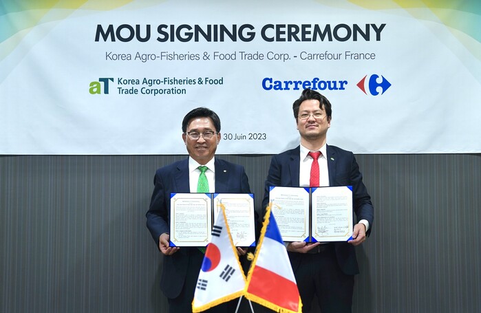 한국농수산식품유통공사(사장 김춘진)는 프랑스 현지시간 30일 파리에서 K-푸드 수출 확대와 저탄소 식생활 확산을 위해 프랑스의 까르푸(대표 알렉상드르 봉파르)와 히에코(대표 이정근), 오스트리아의 판아시아(회장 정종완)와 업무협약을 체결했다.