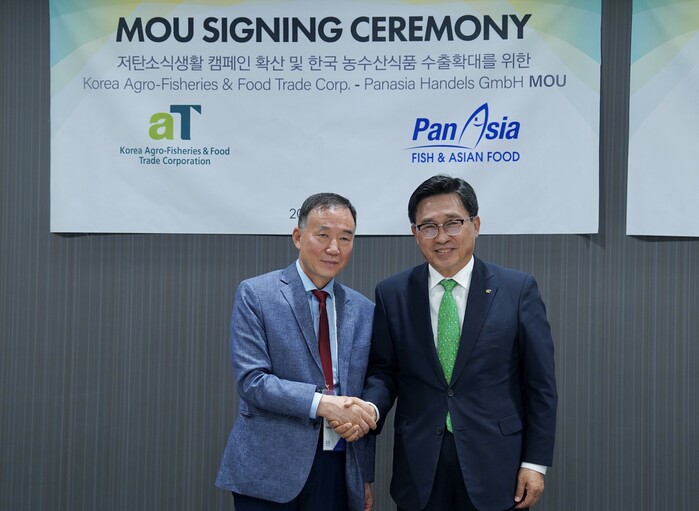 ▲ 한국농수산식품유통공사 김춘진 사장(우측)과 판아시아 정종완 회장(좌측)이 한국농수산식품유통공사-오스트리아 판아시아 MOU를 체결하고 있다. 한국농수산식품유통공사 제공 |