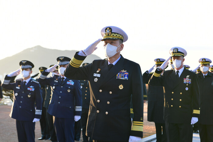 [로컬세계 부산=맹화찬 기자]2일 김명수(중장) 해군작전사령관 등 부산지역의 육・해・공군 및 주한미해군사령부 고위 지휘관들이 계묘년 새해를 맞아 대한민국 수호 의지를 결의하며 부산 중앙공원 충혼탑을 방문, 헌화 및 신년 참배를 했다. 경례하고 있다.