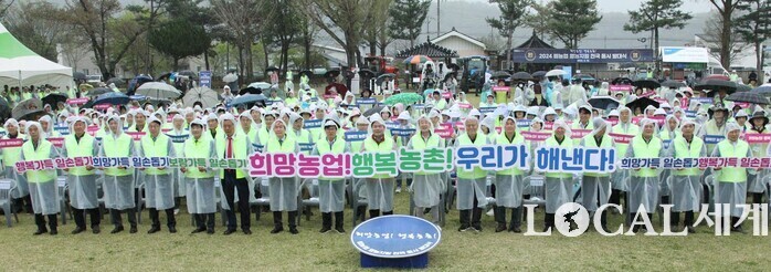강호동 회장과 참석자들이 발대식 퍼포먼스를 하고 있다. 농협중앙회는 15일 경북 의성군에서 본격적인 영농철이 도래하였음을 국민들에게 알리고 범국민적 농촌일손돕기 참여 확산을 위한 2024년「범농협 영농지원 전국 동시 발대식」을 개최했다.