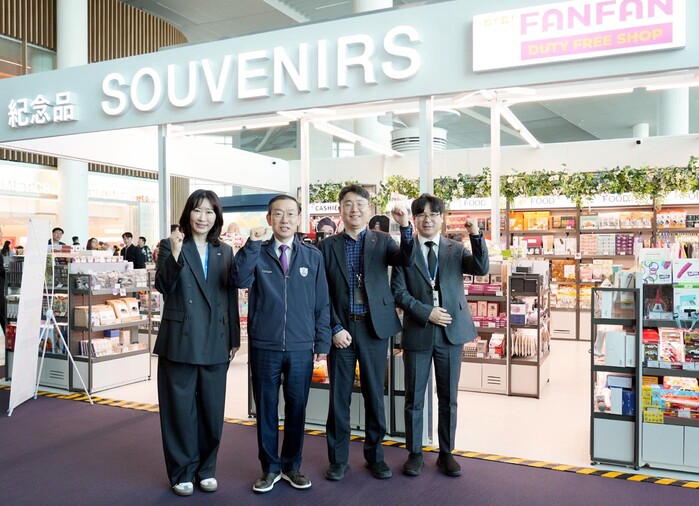 ▲이명구 관세청 차장(왼쪽 두번째)이 13일 인천공항 출국장 내 판판 면세점을 방문해 기념촬영을 하고 있다 |