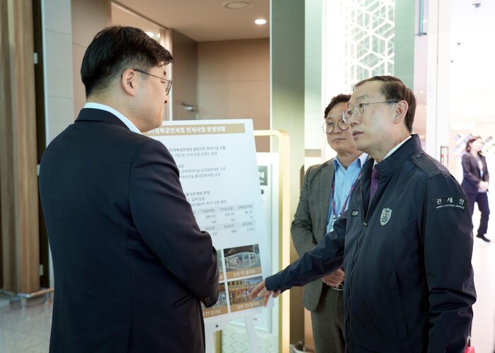 ▲이명구 관세청 차장(오른쪽)이 13일 인천공항 출국장 내 경복궁 면세점을 방문해 면세점 발전방안 등에 대해 논의하고 있다. 관세청 제공 |