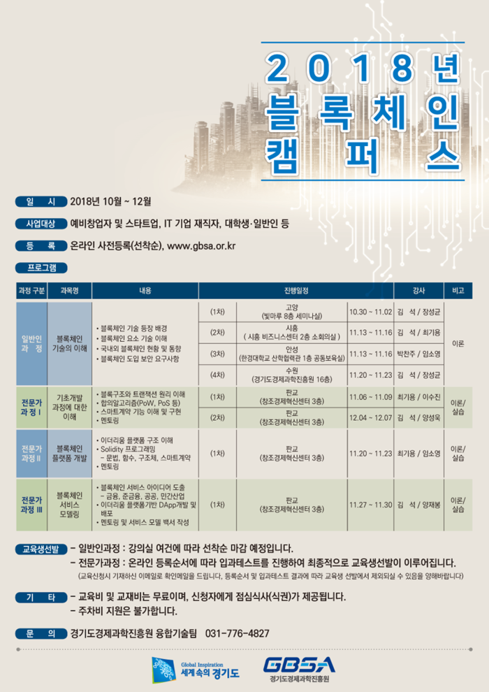 전국 최초인 ‘블록체인 캠퍼스’는 경기도가 블록체인 산업의 저변확대와 관련 분야 전문인력 양성을 위해 올해 상반기부터 시행한 전문교육 프로그램이다.